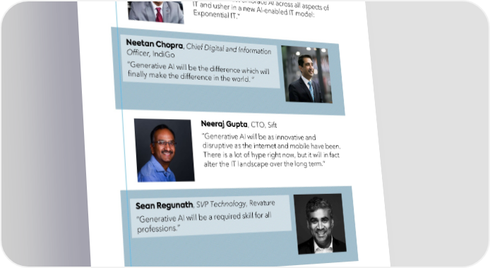 , President AI (FAIR), Technology and Sustainability, Rackspace “IT leaders must embrace AI across all aspects of IT and usher in a new AI-enabled IT model: Exponential IT.” , Chief Digital and Information Officer, IndiGo “Generative AI will be the difference which will finally make the difference in the world. “ , CTO, Sift “Generative AI will be as innovative and disruptive as the internet and mobile have been. There is a lot of hype right now, but it will in fact alter the IT landscape over the long term.” , SVP Technology,Revature “Generative AI will be a required skill for all professions.” , CISO, Bank of Hope "The CISO role is changing and carries a lot of liability with all the new rules and regulations coming into play. This will force the industry to change the way the organizations protect individuals in these roles, similar to how CFOs are protected today.”