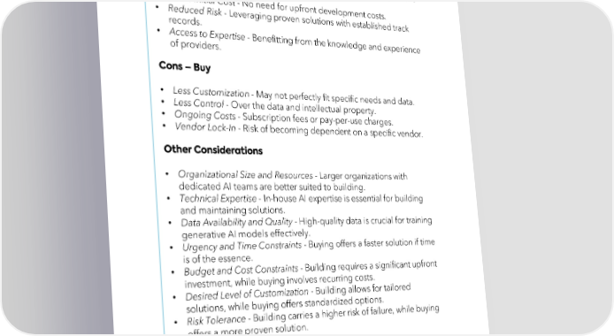 • Faster Time-to-Market - Can access existing solutions and implement them quickly. • Lower Initial Cost - No need for upfront development costs. • Reduced Risk - Leveraging proven solutions with established track records. • Access to Expertise- Benefitting from the knowledge and experience of providers. • Less Customization- May not perfectly fit specific needs and data. • Less Control - Over the data and intellectual property. • Ongoing Costs-Subscription fees or pay-per-use charges. • Vendor Lock-In- Risk of becoming dependent on a specific vendor. • Organizational Size and Resources - Larger organizations with dedicated AI teams are better suited to building. • Technical Expertise - In-house AI expertise is essential for building and maintaining solutions. • Data Availability and Quality - High-quality data is crucial for training generative AI models effectively. • Urgency and Time Constraints- Buying offers a faster solution if time is of the essence. • Budget and Cost Constraints - Building requires a significant upfront investment, while buying involves recurring costs. • Desired Level of Customization - Building allows for tailored solutions, while buying offers standardized options. • Risk Tolerance - Building carries a higher risk of failure, while buying offers a more proven solution. , CIO, Matterport “It’s the right time to make surgical investments that turn the value-add drivers – operational efficiency and/or increased revenue.”