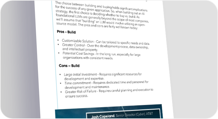 The vast majority of applications will be powered by LLMs inside of the next five years. Organizations today aren’t having too much trouble finding early use cases, but many are at a crossroads when determining how best to proceed. The choice between building and buying holds significant implications for the success of any given application. So, when building out an AI strategy, the first choice is deciding whether to buy vs. build. As foundational LLMs are generally beyond the scope of most companies, we’ll assume that “building” an LLM would involve utilizing an open- source model. The pros and cons are fairly well known today: • Customizable Solution - Can be tailored to specific needs and data. • Greater Control - Over the development process, data ownership, and intellectual property. • Potential Cost Savings - In the long run, especially for large organizations with consistent needs. • Large Initial Investment – Requires significant resources for development and expertise. • Time commitment –Requires dedicated time and personnel for development and maintenance. • Greater Risk of Failure - Requires careful planning and execution to ensure success. , Senior Director (Cyber), AT&T “AI has the potential to revolutionize our productivity and capabilities. The catch will be to build training models with all these different caveats: Do they accurately reflect our needs? Do they introduce unintended biases? Are they secure and locked down? Are the hallucinations eliminated? This requires a deliberate approach with the right levels of governance in place.”
