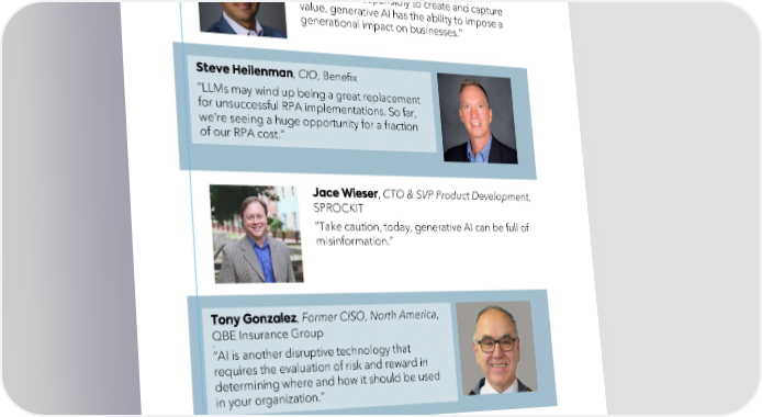 Chief Information, Data and Digital Officer, Ally Financial “When used responsibly to create and capture value, generative AI has the ability to impose a generational impact on businesses.” , CIO, Benefix “LLMs may wind up being a great replacement for unsuccessful RPA implementations. So far, we’re seeing a huge opportunity for a fraction of our RPA cost.” , CTO & SVP Product Development, SPROCKIT “Take caution, today, generative AI can be full of misinformation.” , Former CISO, North America, QBE Insurance Group a “AI is another disruptive technology that requires the evaluation of risk and reward in determining where and how it should be used in your organization.” , Head of Digital Product, Engineering & CX, AT&T a “Don't rush for the shiny object: Define the ‘why’ and bring your people together.”