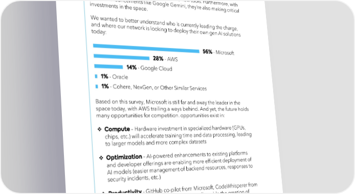 With their infrastructure, resources, and expertise to provide multi-cloud services, hyperscalers are crucially positioned to capitalize on the promise of generative AI, as they can provide the scalable cloud and storage resources necessary to run these new tools. Furthermore, with recent announcements like Google Gemini, they’re also making critical investments in the space. We wanted to better understand who is currently leading the charge, and where our network is looking to deploy their own gen AI solutions today: - Microsoft - AWS - Google Cloud - Oracle - Cohere, NexGen, or Other Similar Services Based on this survey, Microsoft is still far and away the leader in the space today, with AWS trailing a ways behind. And yet, the future holds many opportunities for competition. opportunities exist in: – Hardware investment in specialized hardware (GPUs, chips, etc.) will accelerate training time and data processing, leading to larger models and more complex datasets – AI-powered enhancements to existing platforms and developer offerings are enabling more efficient deployment of AI models (easier management of backend resources, responses to security incidents, etc.) - GitHub co-pilot from Microsoft, CodeWhispererfrom AWS, and IBM Watson Code Assistant will enable the creation of test cases and test documents, and assist developers in writing clean, efficient code - Hyperscalers are heavily investing in large language models, as cloud computing offers the perfect solution for processing LLMs