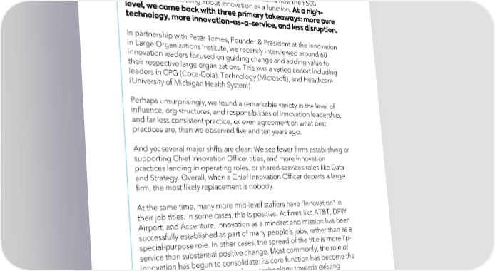 In a year where innovation feels so urgent with the improvements across the AI landscape, we wanted to better understand how the F500 ecosystem was thinking about innovation as a function. In partnership with Peter Temes, Founder & President at the Innovation in Large Organizations Institute, we recently interviewed around 60 innovation leaders focused on guiding change and adding value to their respective large organizations. This was a varied cohort including leaders in CPG (Coca-Cola), Technology (Microsoft), and Healthcare (University of Michigan Health System). Perhaps unsurprisingly, we found a remarkable variety in the level of influence, org structures, and responsibilities of innovation leadership, and far less consistent practice, or even agreement on what best practices are, than we observed five and ten years ago. And yet several major shifts are clear: We see fewer firms establishing or supporting Chief Innovation Officer titles, and more innovation practices landing in operating roles, or shared-services roles like Data and Strategy. Overall, when a Chief Innovation Officer departs a large firm, the most likely replacement is nobody. At the same time, many more mid-level staffers have “innovation” in their job titles. In some cases, this is positive. At firms like AT&T, DFW Airport, and Accenture, innovation as a mindset and mission has been successfully established as part of many people’s jobs, rather than as a special-purpose role. In other cases, the spread of the title is more lip- service than substantial positive change. Most commonly, the role of innovation has begun to consolidate: its core function has become the exploration and deployment of new technology towards existing operations and goals. We expect this phase to last at least five years, at which point there may be a cyclical swing back to business-model and more strategic innovation activities. We conducted solo and group interviews with about 60 innovation leaders, defining the head of innovation as the key executive who has responsibility for the processes that identify, test, and hand-off early- state new products, business models, and operational processes.