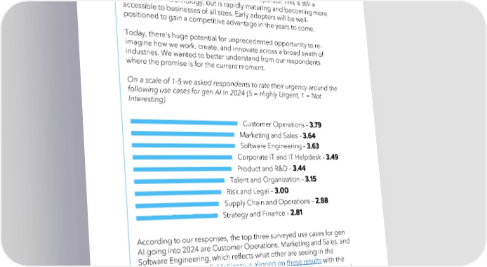 Gen AI is emerging as a powerful new tool for CXO buyers, with the potential to revolutionize the way businesses operate. This is still a relatively new technology, but is rapidly maturing and becoming more accessible to businesses of all sizes. Early adopters will be well- positioned to gain a competitive advantage in the years to come. Today, there’s huge potential for unprecedented opportunity to re- imagine how we work, create, and innovate across a broad swath of industries. We wanted to better understand from our respondents where the promise is for the current moment. On a scale of 1-5 we asked respondents to rate their urgency around the following use cases for gen AI in 2024 (5 = Highly Urgent, 1 = Not Interesting) Customer Operations – Marketing and Sales – Software Engineering – Corporate IT and IT Helpdesk – Product and R&D – Talent and Organization – Risk and Legal – Supply Chain and Operations – Strategy and Finance – According to our responses, the top three surveyed use cases for gen AI going into 2024 are Customer Operations, Marketing and Sales, and Software Engineering, which reflects what other are seeing in the broader market as well. McKinsey is aligned on these results with the caveat that software engineering is the strongest in the tech sector, and customer operations are the weakest in sectors that don’t traditionally need them (e.g. education, pharma, manufacturing, electronics). For at least the next 1-2 years, AI’s role will be primarily assistive (content generation, code completion, enterprise search), not autonomous.