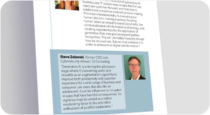 CTO, NIHR Clinical Research Network “To get the maximum value out of generative AI, business and IT leaders must ensure that the use cases are customer-focused, and that trust is established in machine-enabled decision making. This means fundamentally re-evaluating our human decision-making practices, focusing human talent on empathy-based social skills, the contextualization of information and strategy, and creating opportunities for the application of generative AI to data processing and pattern recognition. This will ultimately massively disrupt how we do business. But we must embrace it in order to achieve true digital transformation.” , Former CISO Levi, Cybersecurity Advisor, S3 Consulting “Generative AI is entering the adolescent stage where it’s becoming useful and valuable as an augmentation capability to improve both productivity and customer experience for a wide range of business and consumer use cases. But also like an adolescent, it can be influenced or co-opted in ways that have harmful consequences. So, vigilance must be added as a critical moderating factor to the unbridled enthusiasm of youthful exuberance.” , CIO, Teleperformance “AI will amplify human potential.”