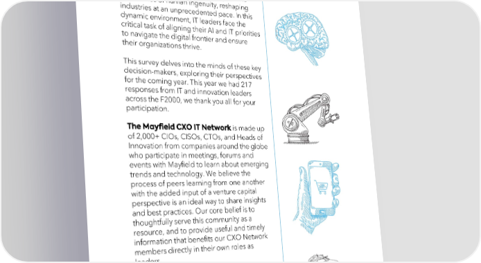 As we stand on the precipice of 2024, the tech landscape continues to present both exciting opportunities and challenges. Artificial intelligence is starting to push the boundaries of human ingenuity, reshaping industries at an unprecedented pace. In this dynamic environment, IT leaders face the critical task of aligning their AI and IT priorities to navigate the digital frontier and ensure their organizations thrive. This survey delves into the minds of these key decision-makers, exploring their perspectives for the coming year. This year we had 217 responses from IT and innovation leaders across the F2000, we thank you all for your participation. is made up of 2,000+ CIOs, CISOs, CTOs, and Heads of Innovation from companies around the globe who participate in meetings, forums and events with Mayfield to learn about emerging trends and technology. We believe the process of peers learning from one another with the added input of a venture capital perspective is an ideal way to share insights and best practices. Our core belief is to thoughtfully serve this community as a resource, and to provide useful and timely information that benefits our CXO Network members directly in their own roles as leaders. We learn from your input we and hope we’ve gathered peer feedback in a way that is useful to your team in 2024 and beyond. -Gamiel & Shelby