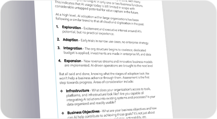 According to McKinsey’s State of AI report in August, the percentage of organizations adopting AI has remained steady at 55%, with many respondents implementing AI in only one or two business functions. This indicates that AI usage today is still limited in scope with considerable untapped potential for value capture in the future. At a high level, AI adoption within large organizations has been following a similar trend to that of cloud and digitization in the past: – Excitement and executive interest around AI’s potential, but no practical experience. – Early trials in narrow use cases, no enterprise strategy – The org structure begins to coalesce; dedicated budget is applied, investments are made in enterprise ML and data – New revenue streams and innovative business models are implemented. AI-driven operations are brought to the next level But all said and done, knowing what the stages of adoption look like won’t help a business advance through them. Assessment is the first step towards progress. Areas of consideration include: – What does your organization’s access to tools, platforms, and infrastructure look like? Are you capable of integrating AI solutions into existing systems and processes? Is your data organized and readily usable? – What are your business objectives and how can AI help contribute to achieving those goals? It’s not just about the use cases, but the ROI, potential risks, actionability, etc. – What will your AI policy look like? This could include categories like data management, privacy, and ethical considerations, as well as establishing roles around AI governance – What are your talent capabilities in terms of AI? Who is in your org today and who could you attract? How could you train or upskill existing employees?