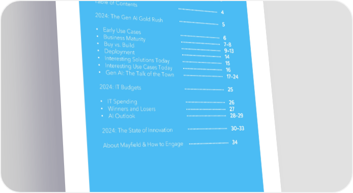 Foreword Key Takeaways Table of Contents 2024: The Gen AI Gold Rush • Early Use Cases • Business Maturity • Buy vs. Build • Deployment • Interesting Solutions Today • Interesting Use Cases Today • Gen AI: The Talk of the Town 2024: IT Budgets • IT Spending • Winners and Losers • AI Outlook 2024: The State of Innovation About Mayfield & How to Engage