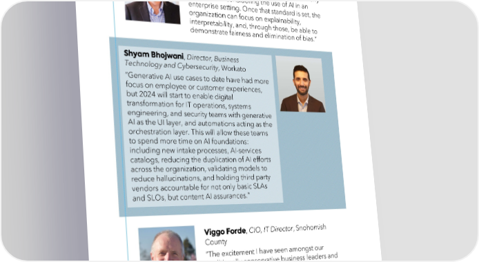 SVP IT, Xilio Therapeutics “An ethical standard should be emplaced in any organization considering the use of AI in an enterprise setting. Once that standard is set, the organization can focus on explainability, interpretability, and, through those, be able to demonstrate fairness and elimination of bias.” , Director, Business Technology and Cybersecurity, Workato “Generative AI use cases to date have had more focus on employee or customer experiences, but 2024 will start to enable digital transformation for IT operations, systems engineering, and security teams with generative AI as the UI layer, and automations acting as the orchestration layer. This will allow these teams to spend more time on AI foundations: including new intake processes, AI-services catalogs, reducing the duplication of AI efforts across the organization, validating models to reduce hallucinations, and holding third party vendors accountable for not only basic SLAs and SLOs, but content AI assurances.” , CIO, IT Director, Snohomish County “The excitement I have seen amongst our traditionally conservative business leaders and elected officials has truly been inspiring and bodes well for our ability to get air under our AI wings in 2024.”