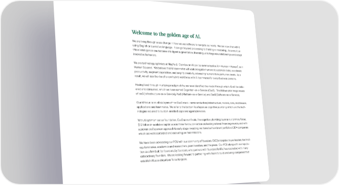 Welcome to the golden age of AI. We are living through a sea change in how we use software to navigate our world. We can now chat with it using English or our native language. lt can go beyond processing to thinking or reasoning. As a result, ar ti昀椀cial intelligence can become intelligent augmentation, liberating us to forge new relationships and adopt innovative behaviors. 2 We are technology optimists at May昀椀eld. Our view on AI can be summarized as AI + Human = Human , as in Human Squared. We believe that AI teammates will work alongside humans to automate tasks, accelerate productivity, augment capabilities, and amplify creativity, advancing humans to superhuman leveis. As a result, we will see the rise of a new hybrid workforce, with AI teammates for every business persona. Having lived through multiple paradigm shifts, we have identi昀椀ed the model through which AI will be deliv ered and consumed, which we have named Cognition-as-a-Service (CaaS). This follows prior mega waves of laaS (lnfrastructure-as-a-Service), PaaS (Platform-as-a-Service) and SaaS (Software-as-a-Service). Our AI focus is on ali six layers of the CaaS stack - semiconductors/infrastructure, models, data, middleware, applications and teammates. We refer to the bottom four layers as cognitive plumbing which are the tech nologies required to build AI enabled apps and agents/services. With AI optimism as our foundation, CaaS as our thesis, the cognitive plumbing layer as our primary focus, $1.2 billion in available capital across three funds, conviction on leading rational 昀椀nancing rounds, and with a proven craftsperson approach to early stage investing, we have built a vibrant portfolio of 20+ companies which are well capitalized and executing on their missions. We have been advocating our POV with our community of founders, CXO/enterprise buyer leaders, technol ogy luminaries, academics and researchers, peer investors, and the press. Our POV along with our reputa tion as a 昀椀rm built for founders, by founders, who partners with founders for life, has resonated with many extraordinary founders. We are looking forward to partnering with them to build enduring companies that establish AI as a ubiquitous force for good.