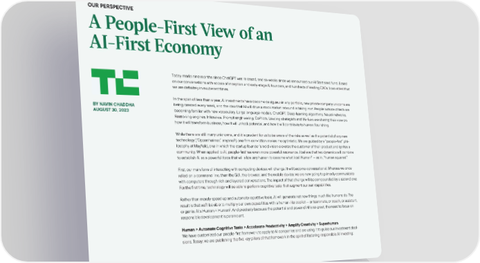 OUR PERSPECTIVE A People-First 嘀椀ew of an AI-First Economy Today marks nine months since ChatGPT was released, and six weeks since we announced our AI Start seed fund. Based on our conversations with scores of inception and early-stage AI founders, and hundreds of leading CXOs, 1 can attest that we are de昀椀nitely in exuberant times. ln the span of less than a year, AI investments have become de rigueur in any portfolio, new private company unicorns are being created every week, and the idea that AI will drive a stock market rebound is taking root. People outside of tech are BY NAVIN CHADDHA becoming familiar with new vocabulary. Large language models. ChatGPT. Deep-learning algorithms. Neural networks. AUGUST 30, 2023 Reasoning engines. lnference. Prompt engineering. CoPilots. Leading strategists and thinkers are sharing their view on how it will transform business, how it will unlock potential, and how it will contribute to human fiourishing. While there are still many unknowns, and it is prudent for us to be aware of the risks as well as the potential of any new technology ("Oppenheimer," anyone?), one 昀椀rm conviction makes me optimistic. We are guided by a "people-昀椀rst" phi losophy at May昀椀eld, one in which the startup founder's bold vision elevates the customer of their product and ignites a community. When applied to AI, people-昀椀rst has even more powerful resonance. 1 believe that two dynamics will combine 2 to establish AI as a powerful force that will allow any human to become what I call Human - as in, "human squared." First, our main form of interacting with computing devices will change. lt will become conversational. Whereas we once relied on a command line, then the GUI, the browser, and the mobile device, we are now going to primarily communicate with computers through rich and layered conversations. The impact of that change will be compounded by a second one: For the 昀椀rst time, technology will be able to perform cognitive tasks that augment our own capabilities. Rather than merely speed up and automate repetitive tasks, AI will generate net new things much like humans do. The result is that we'II be able to multiply our own capabilities with a human-like copilot - or teammate, or coach, or assistant, 2 . And precisely because the potential and power of AI is so great, the need to focus on or genie. AI x Human = Human responsible development is paramount. Human > Automate Cognitive Tasks > Accelerate Productivity > Amplify Creativity > Superhuman We have customized our people-昀椀rst framework to apply to AI companies and are using it to guide our investment deci sions. Today, we are publishing the 琀椀ve key pillars of that framework in the spirit of fostering responsible AI investing: